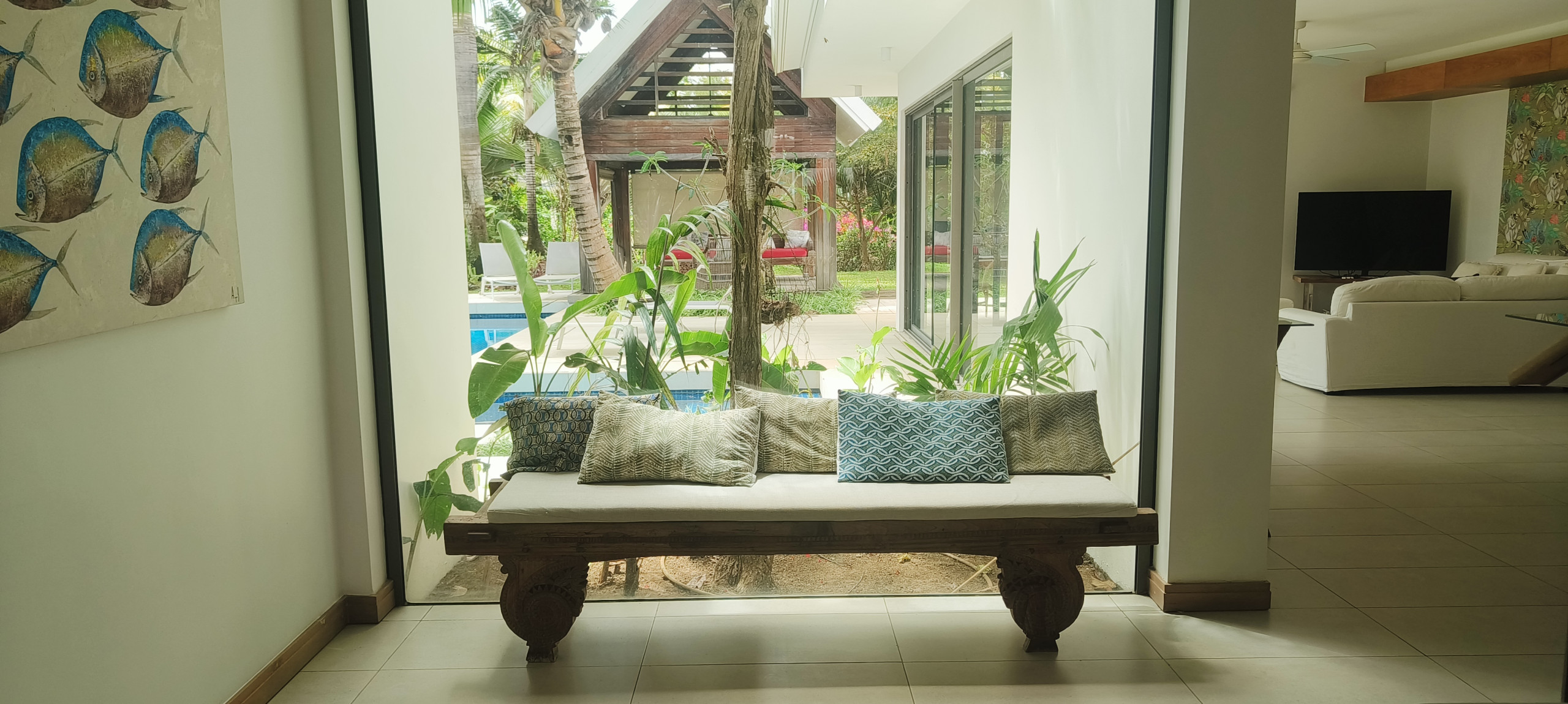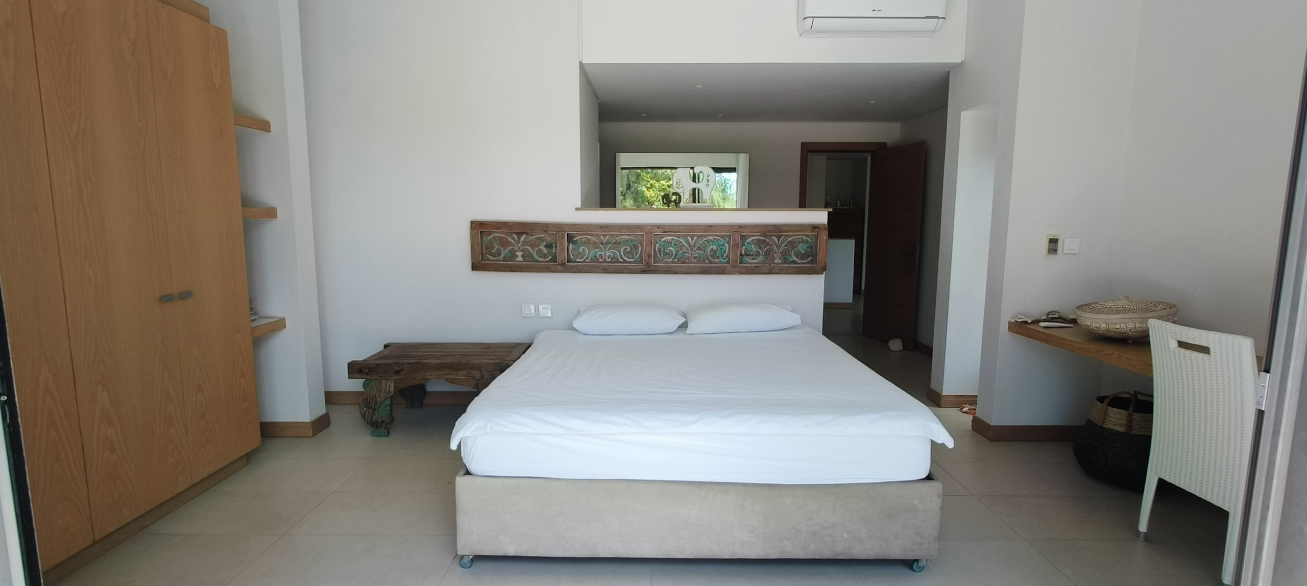 L'intérieur de la villa est spacieux et lumineux, avec une cuisine américaine entièrement équipée (réfrigérateur, lave-linge, lave-vaisselle, four, micro-ondes, etc.) et un salon cosy. Tous les espaces de vie sont climatisés pour votre confort. Vous pourrez également profiter du wifi et de la télévision par satellite.